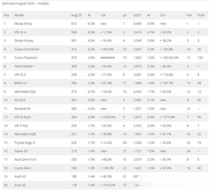 奔驰(+2.7%):排名第三,表现相对平稳。排名第四的 Cupra(+432.3%)继续令人震惊,市场份额创下8.1%的纪录。