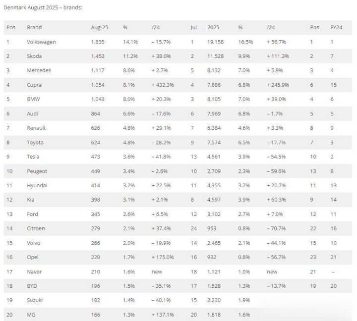 2025年8月,丹麦汽车销量同比微增1.4%至13,030辆。
